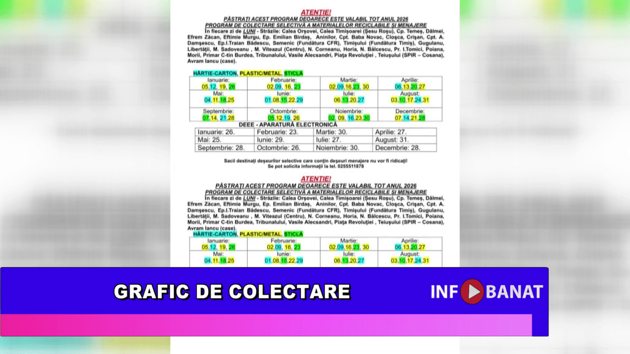 Municipiul Caransebeș a făcut public graficul de colectare a deșeurilor menajere și selective pentru anul 2026.