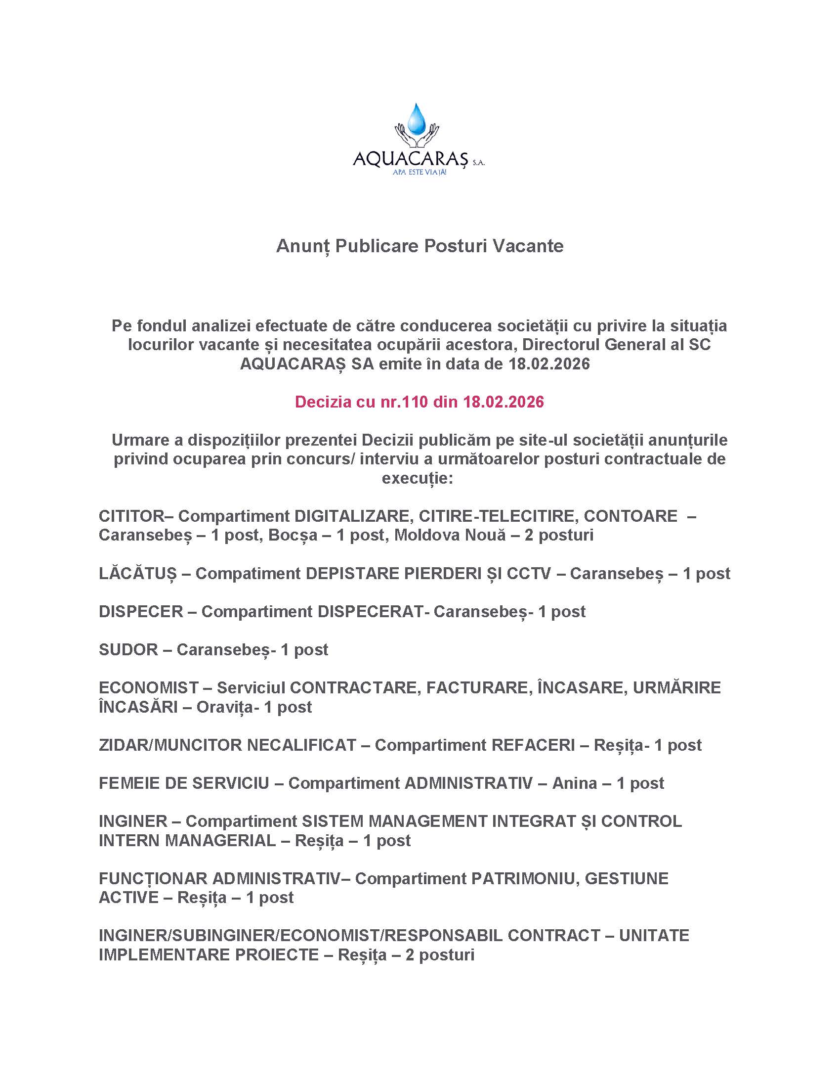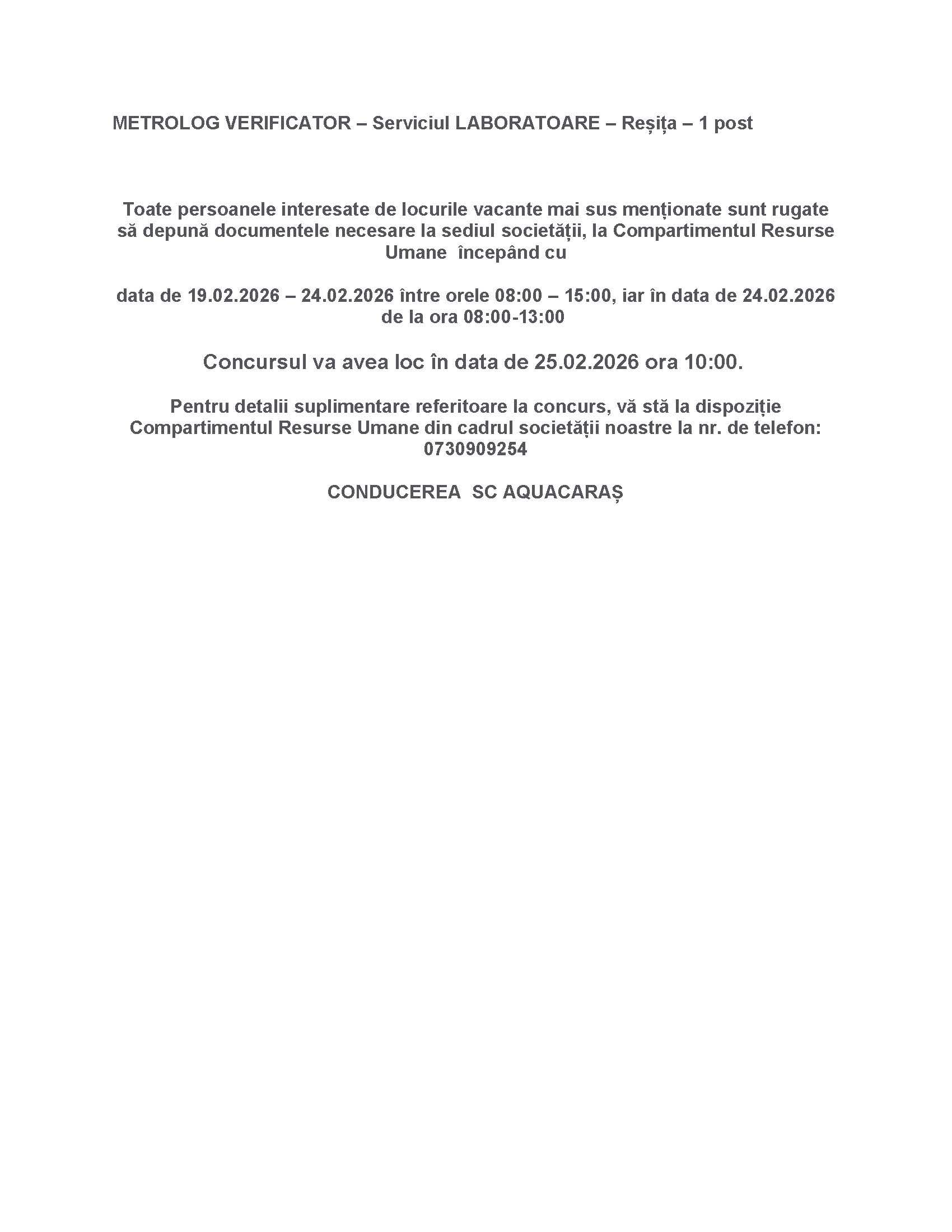 Posturi Vacante-Concurs/interviu în data de 25.02.2026 de la ora 10:00 – Aquacaraș